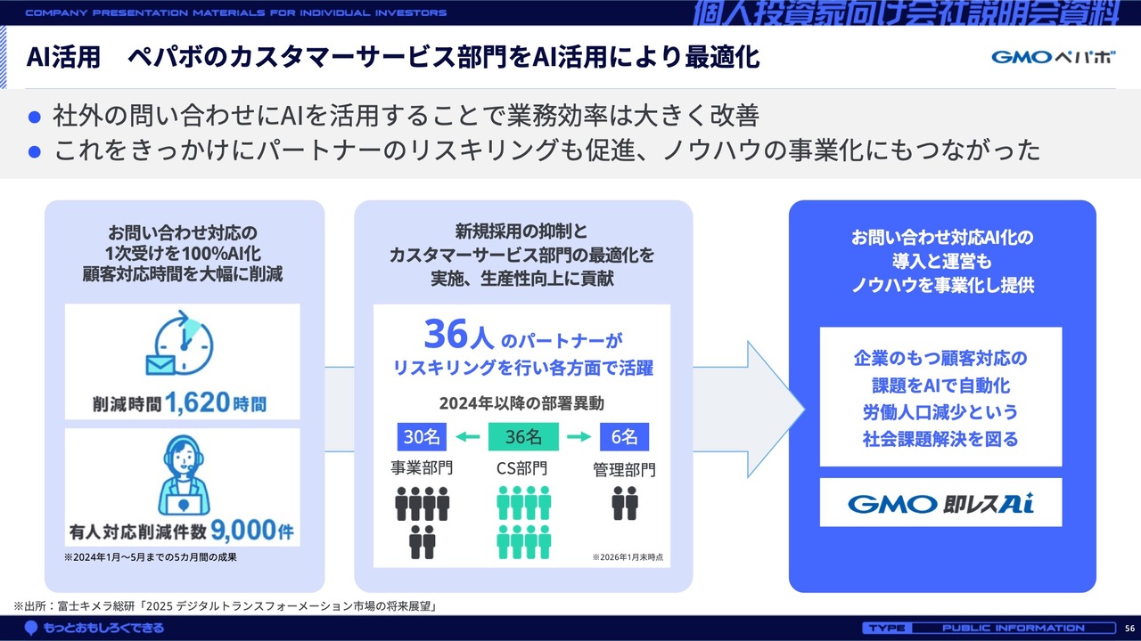 これまでは問い合わせ対応が中心でしたが、当社ではAIエージェントの活用を進め、導入支援を行っています。その結果、例えばカスタマーサポート(CS)の対応速度の向上や、業務改善も可能になると考えています。
