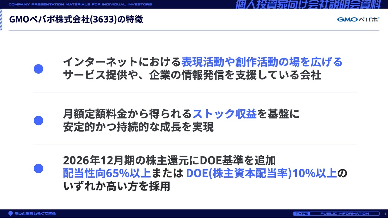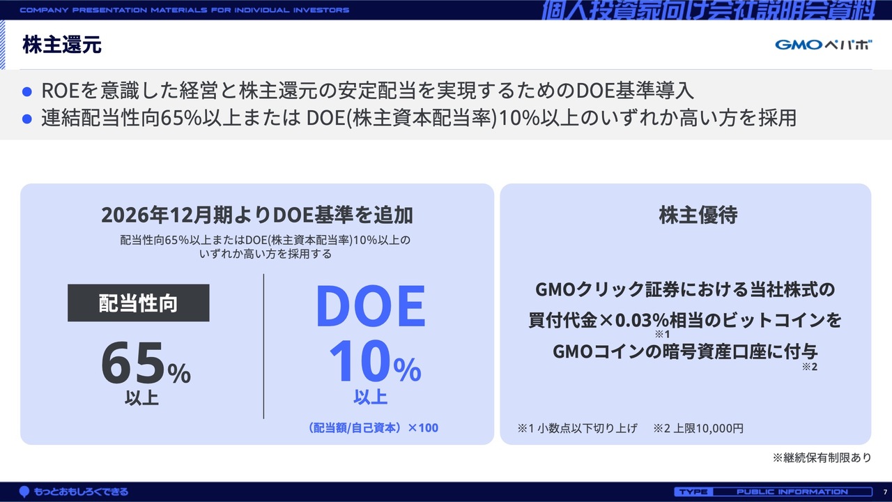 株主還元は、これまで配当性向65パーセント以上を基準として設けていましたが、新たにDOE(株主資本配当率)10パーセント以上を追加し、今後はいずれか高いほうを採用します。以上の3点が、私どもの特徴です。