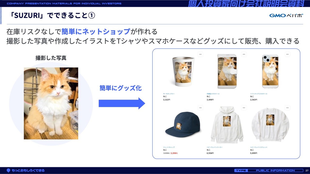 佐藤:例えばスライドの写真は、当社IRチームのメンバーが飼っているペットのマロンちゃんです。このマロンちゃんのグッズを自分のネットショップで販売したい場合、1枚の画像からでも当社が工場と直接連携し、在庫1個からでも生産できるという仕組みです。