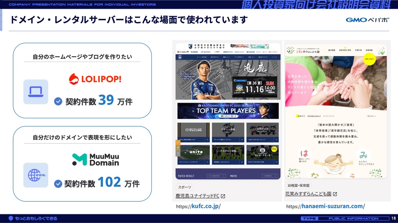 佐藤:「ロリポップ!」をご契約いただいている件数は39万件、「ムームードメイン」では102万件のドメインをお預かりしている状況です。さまざまなかたちでWebサイトを作成いただき、企業や個人の方々がそれぞれWebサイトを提供されています。