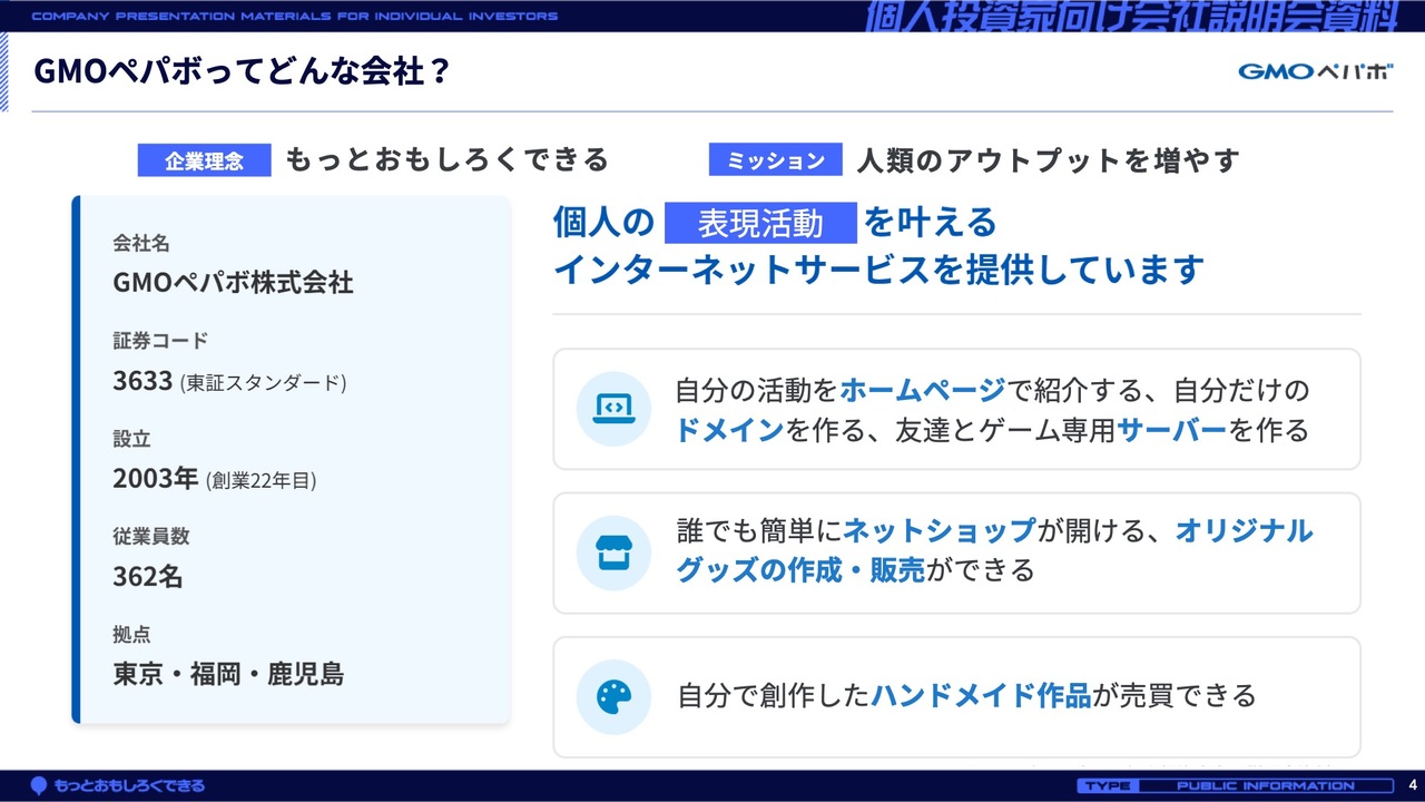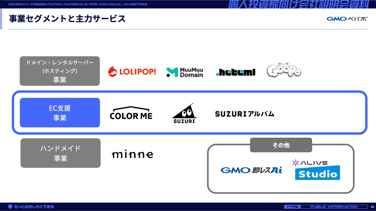 1つ目はインターネットのホームページやドメインを提供する「ドメイン・レンタルサーバー(ホスティング)事業」、2つ目はECサイトを構築する際に裏側を提供する「EC支援事業」、3つ目はハンドメイド作品を制作している作家向けにプラットフォームを提供する「ハンドメイド事業」です。