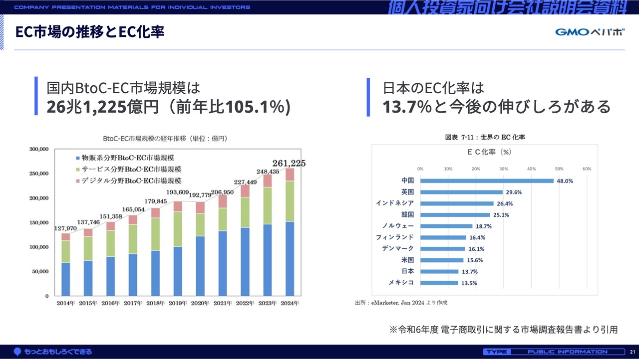 スライド右側に記載のとおり、日本のEC化率はまだ低い状況であり、中国と比較すると伸びしろがあるといえます。