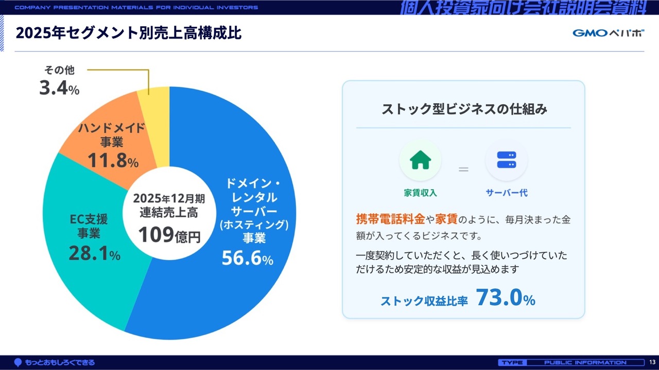 佐藤:セグメント別の構成です。もともとはドメイン・レンタルサーバー事業から始めており、この事業が現在、全体の56.6パーセントを占めています。EC支援事業は28.1パーセント、ハンドメイド事業は11.8パーセントです。
