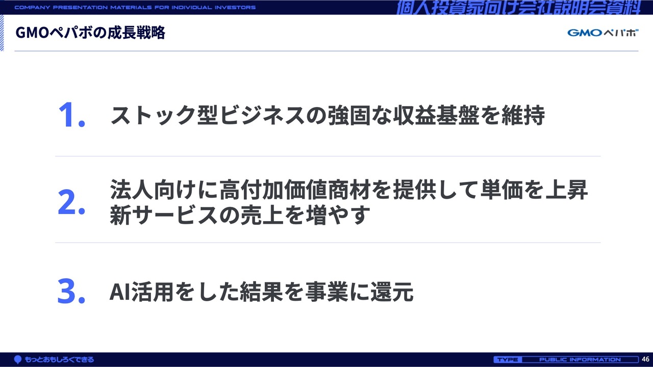 営業利益は、AI活用や売上のストック増加による影響で上昇しており、この利益を配当などでしっかりと還元したいと考えています。今後もストックベースを特に法人領域で強化し、事業成長を実現していきたいと考えています。