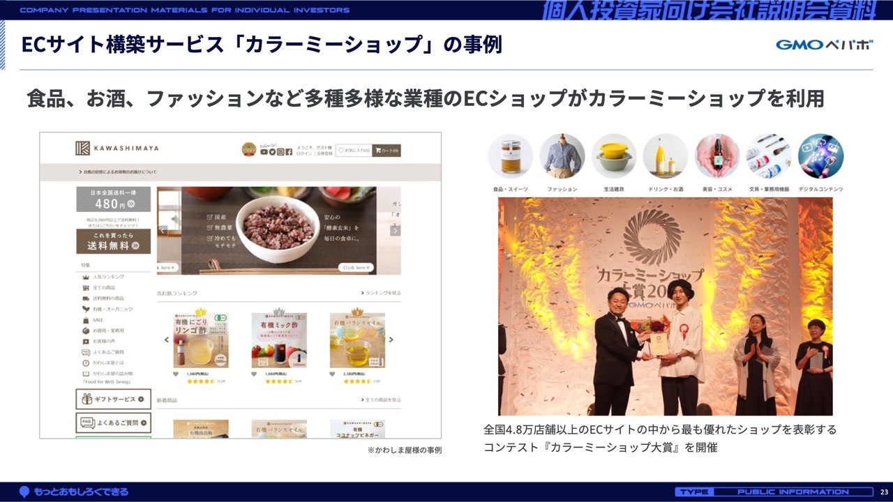 佐藤:食品やお酒、ファッションなど、さまざまなECサイトをご利用いただいています。また、定期的に「カラーミーショップ」大賞を開催し、日本全国の注目されるECサイトを表彰しています。