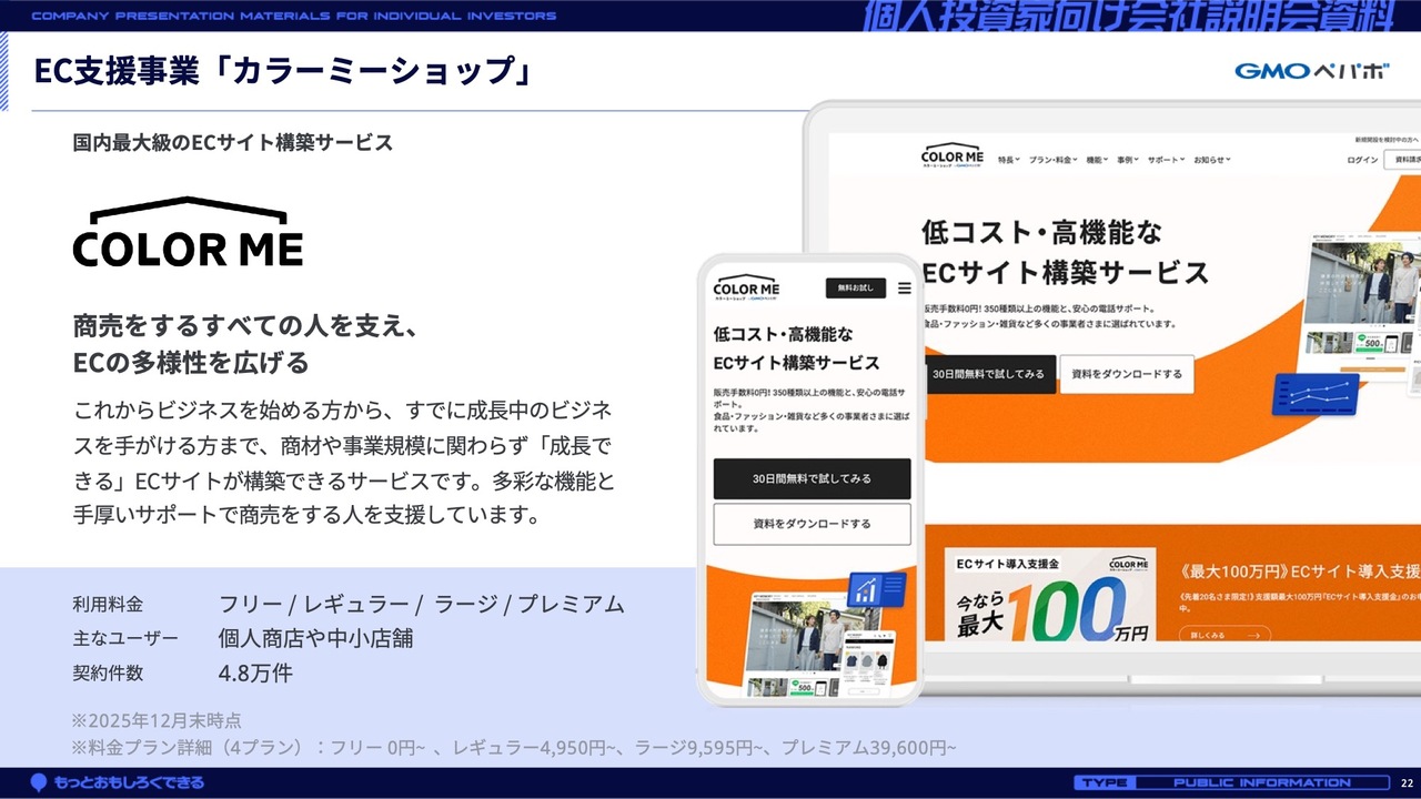 佐藤:そのような中、私たちが提供しているのは、「カラーミーショップ」というサービスです。インターネット上で物を販売したい個人や法人の方々に向けて、ECサイトを提供できるインフラを整えています。