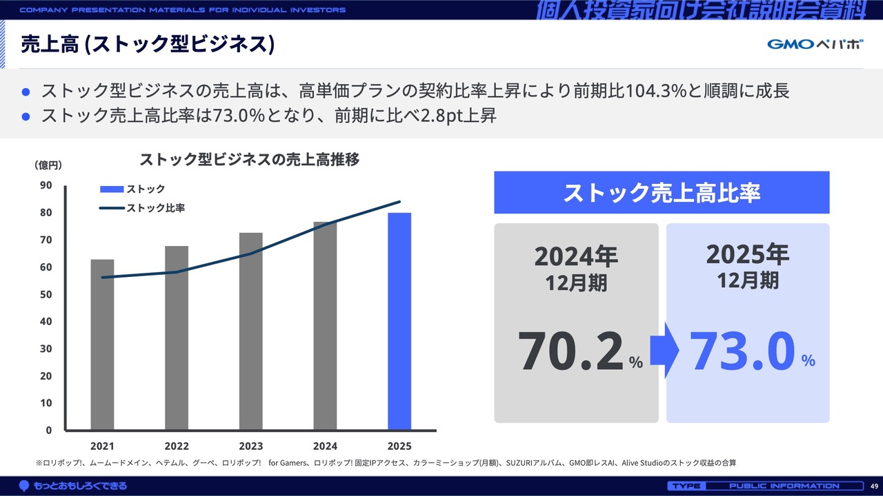 この中でも特に、当社が強みとしているストック型ビジネスの割合は73.0パーセントに達しています。