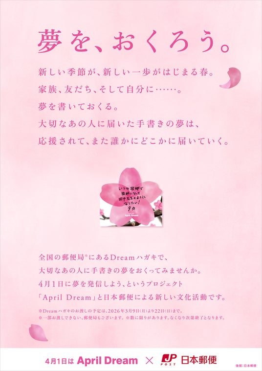 昨年も郵便局窓口にてDreamハガキの配布をお手伝いさせていただいたご縁から、今年はさらに多くのDreamハガキを、全国801の郵便局で配布いたします。デジタルメディアやSNSに普段触れる機会の少ない方を含め、幅広い年代の方々にハガキを直接お受け取りいただくことで、「夢」を“書いて送る”という、新しくも懐かしい手紙文化が一層広がっていくことを心より期待しています。