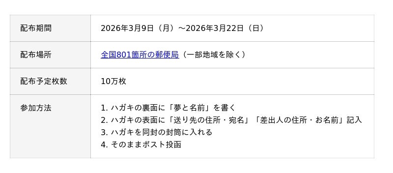 今年は、Dreamハガキの配布枚数は10万枚に、配布郵便局も801箇所と、昨年から大きく増やし、より多くの方にDreamハガキを2026年3月9日(月)よりお届けしてまいります。