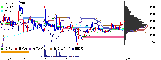 2007年7月20日に出来高急増、一目均衡表雲抜け、7月24日下影陽線。上昇トレンドに入る予感。