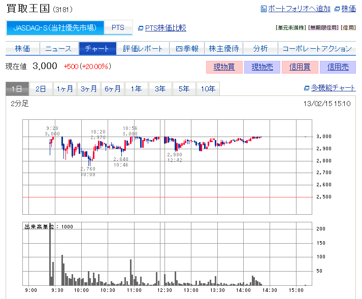 1818円です この会社、新しい会社でいわゆる手垢の付いてない相場です^^; 今が買い時^^・・・・・・・と、私のPCの1台が大底転換を知らせてくれてます 2800円目標でいかがでしょうか?? さて、売るも買うも自己責任でおねがいしますね^^;