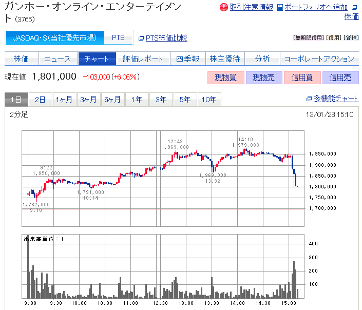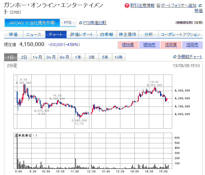 グリー、DeNAのSNS関係は一時の勢いを失い、かといってコンシューマが盛り返している感じもしないし・・・。 実はマイクロソフトの一人勝ちなんじゃないか、という気すらしています。 ・・・ああ、そういえばあのオバケ銘柄がありましたね。 ガンホー! ガンホー!!