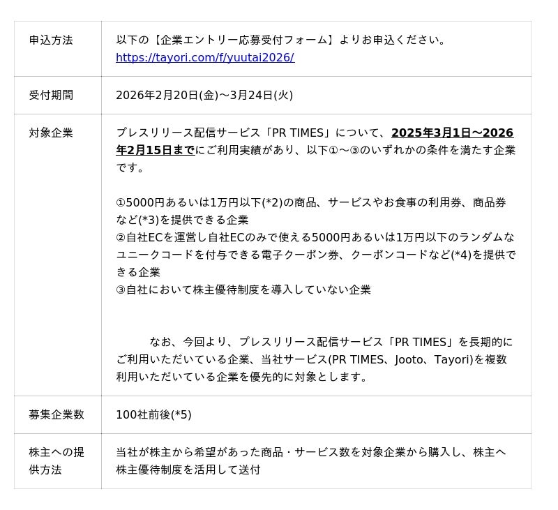 2026年版では、プレスリリース配信サービス「PR TIMES」を長期的にご利用いただいている企業、当社サービス(PR TIMES、Jooto、Tayori)を複数利用いただいている企業を優先的に対象とします(例:PR TIMESとJooto、PR TIMESとTayoriなど複数利用いただいている企業)。本プログラムを通じて、当社株主の皆様には、当社と長く深くつながりのある企業との出会いを楽しんでいただきたいと思っています。当社のサービスを積極的に活用くださる企業がどんな商品やサービスを提供しているのかを知っていただくことで、当社サービスへの理解も深めていただく機会になることを期待しています。2.自社において株主優待制度を導入していない企業が対象