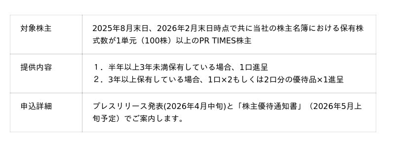 プレスリリース配信サービス「PR TIMES」等を運営する株式会社PR TIMES(東京都港区、代表取締役:山口拓己、東証プライム・名証プレミア:3922)は、2026年2月20日(金)より、株主優待制度を活用した“顧客と株主がつながる”プログラム2026年版の企業エントリーの受付を開始しました。本プログラムは、当社サービス(PR TIMES、Jooto、Tayori)をご利用する企業の商品・サービスを、株主優待制度を活用して当社株主に進呈する取り組みです。本プログラムに参画した企業の商品・サービスから、当社株主が選択したものを当社が購入し、株主へ進呈します(詳細後述)。