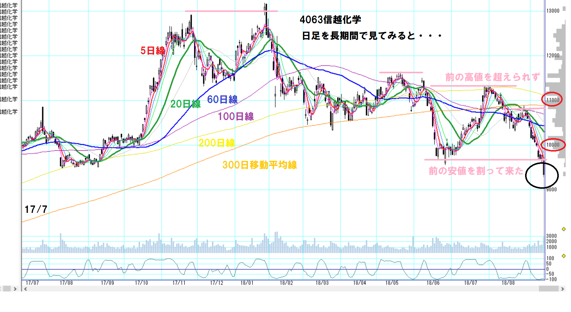 300日移動平均線を割り7月下旬に一旦戻したが、前の高値を超えられず、200日線に当たって再び300日線を割ってきました。これは弱い。当分300日移動平均線は超えられません。60日線は下向き20日線は上値切り下がり、10000円という重要な節目を割り、前の安値を割った来ました。これは、ちょい上げはあるかもしれませんが、下げていく・・パターンかな?