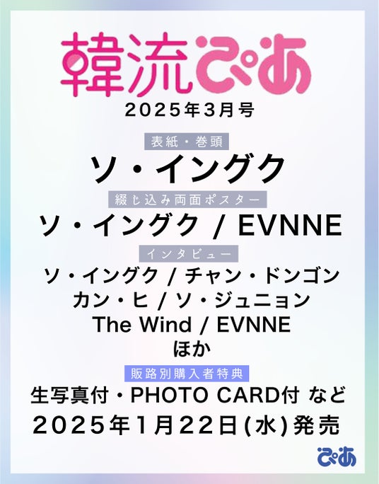 貴社ますますご清祥のこととお慶び申し上げます。『韓流ぴあ』2025年3月号(ぴあ株式会社発行)は、俳優兼歌手として活動するソ・イングクが表紙を飾ります。貴媒体にてご紹介の程、宜しくお願い申し上げます。