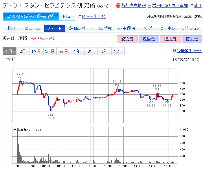 40株ほど所有中の4565そーせいと、他に若干所有中の4576デウエスタン研究所のIRが本日出されましたが、そーせいは開発中の新薬NVA237を欧州で承認申請するというグッドIRで、株価も急騰しているのに対して、デウエスタンは社長が第三者に50万株を貸株するというバッドっぽい微妙な内容でした。 「デ」は会社に金が無くなったので、第三者増資を9/15に発表しています。このため株価は153円から9/... ...続きを読む