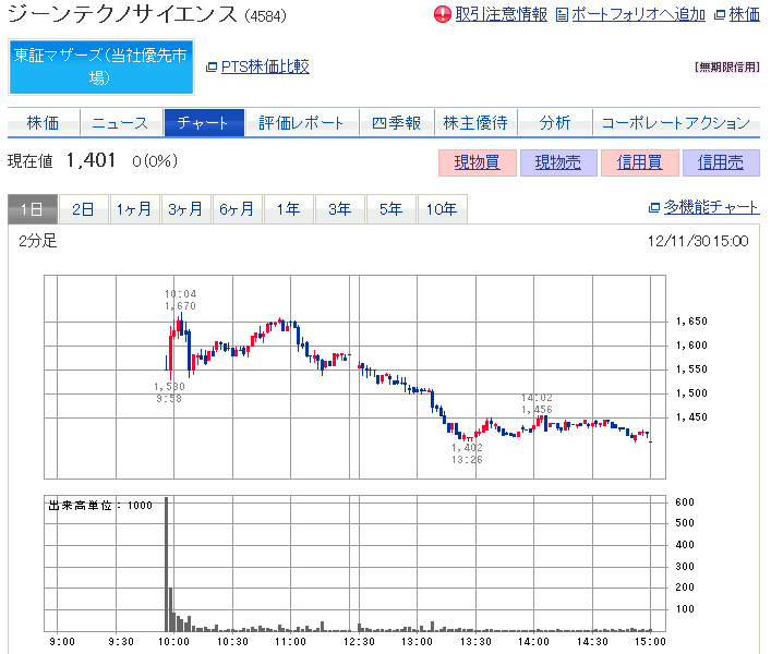 今月末の11/30に新規上場するジーンテクノサイエンス(4584)だが、同社は北海道大学発のバイオベンチャー。 社長は免疫生物研究所(4570)の元取締役であり、大株主の欄には免疫生物研究所の現社長名がある。 免疫は水曜日から突如急騰したが、目立ったIRもなく、どうやら材料としてはこのGTSに絡む思惑だったのかなと思う。 GTSは赤字バイオながら、富士製薬と持田製薬とともに2011年12月26日に... ...続きを読む