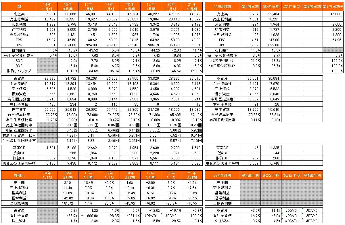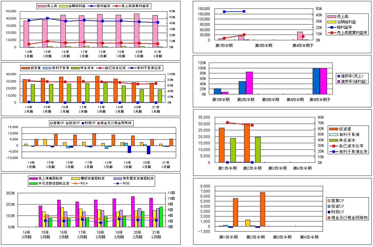 過去の経営成績を見ると、粗利益率は約48%から徐々に減少し2009年3月期で41%になっている。売上高営業利益率は減少傾向にある粗利率に左右されるも、販管費を抑えた効果があり10%から5.6%までしか下がっていない。ROAは7~9%の間で安定している。また、過去数年間を見て有利子負債がほぼないので、健全経営を続けている。