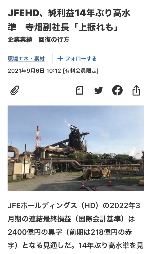14年ぶり2400億黒字も凄いが鋼材価格急騰がリーマン前に迫る勢いであり黒字上振れする。配当利回り7%であり超割安銘柄です。