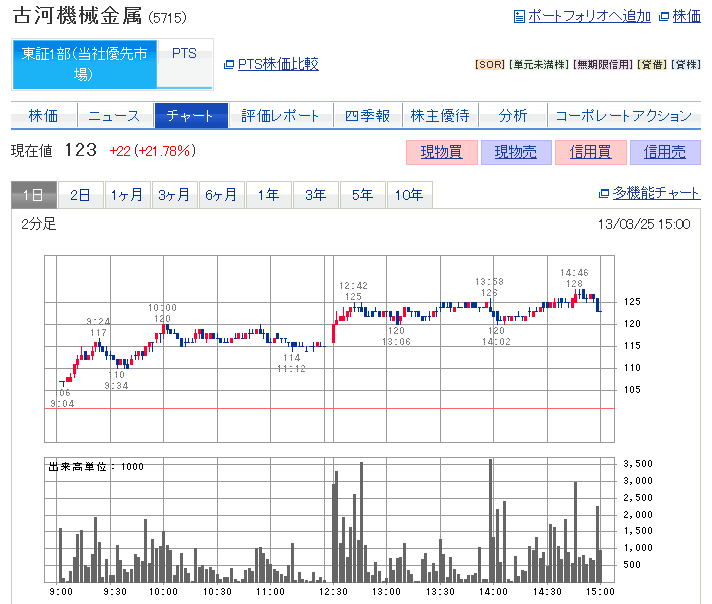 207円高ですか。反発しました。キプロスの件が一段落したようですね。なんか簡単に解決したような感じになりましたが、まだ後を引きそうですよね。ま、とりあえず、良しとしましょう。今日は、古河機械金属をやりました。材料が出ていたので買った... ...続きを読む -