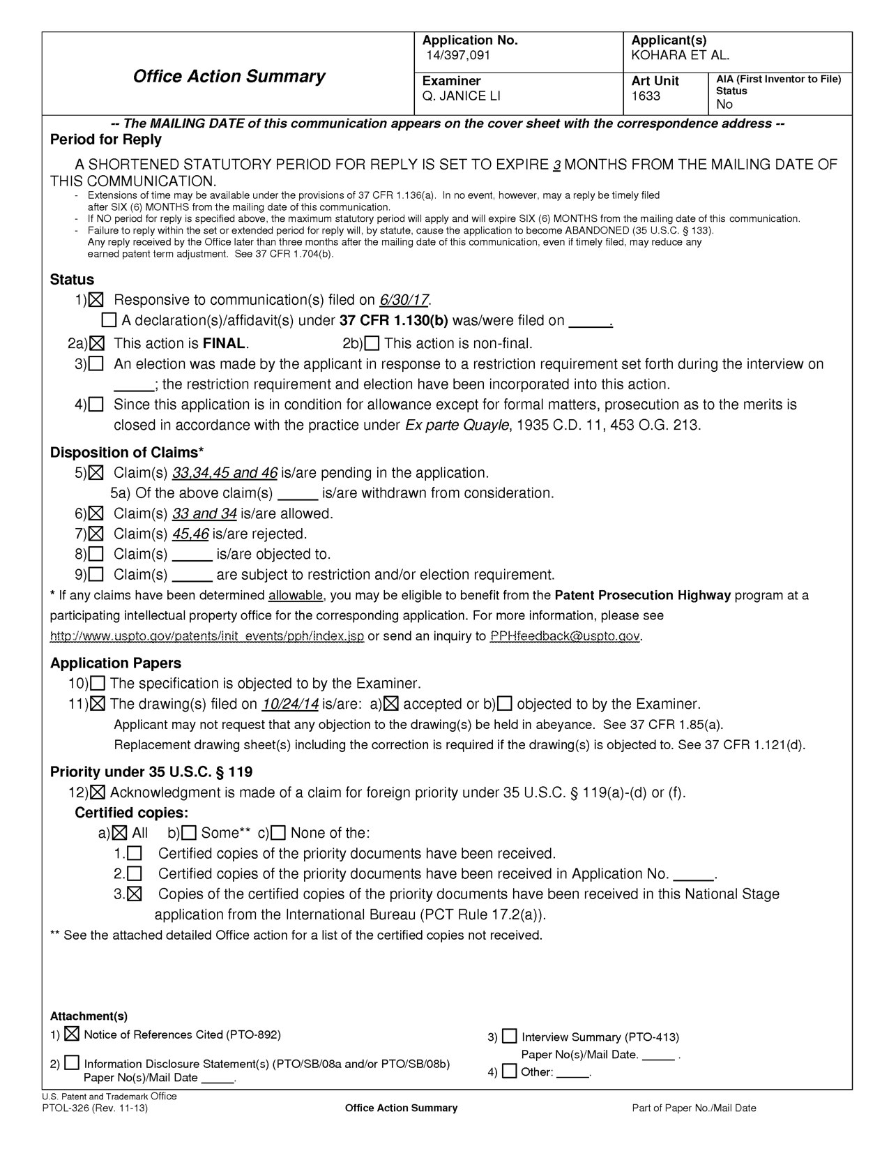 PBXマウス生産に関する米国特許(US2015128298)の審査結果が出ました(9月13日)。なんと、一部の権利範囲について(Claims 33, 34)、審査官はOKしていました。OKとなった権利範囲は日本と比べ、多少狭くなりましたが、PBXマウス生産のビジネス実施部分に相当するものと思われます。PBX側に特に異論なければ、近いうち、OKとなった一部分については、おそらく登録料が支払われ、権利が成立すると見込まれます。これで、他社参入の障壁となり、米国におけるPBXマウスの生産・販売の向上に期待。
