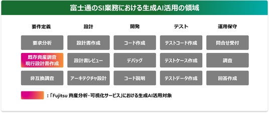当社は、モダナイゼーションを含むシステムインテグレーション(SI)において、要件定義から運用保守に渡る全ての領域で生成AIの活用を強力に推進しています。例えば、当社のシステムエンジニアが使用する開発ツールに生成AIを適用することで、従来手作業で行っていた設計、開発、テスト工程における設計書の執筆やソースコードの作成などの業務を効率化します。また、このほど、SIの初期工程(要件定義)における生成AI活用を実現する「Fujitsu 資産分析・可視化サービス」をお客様向けに提供するなど、あらゆる形で生成AIによる生産性や品質向上につなげSIの変革を加速しています。