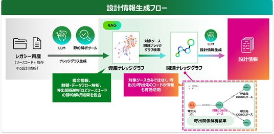 - 生成AIで高品質な設計書生成を支援する「設計書リバースサービス for アプリケーション資産」解析ルールに基づき、機械的にソースコードを一行ずつ解析してシステムの構造を解明する従来の分析手法に、「Fujitsu ナレッジグラフ拡張RAG for Software Engineering」を組み合わせ、資産理解と設計書生成のさらなる高品質化を実現します。本技術では生成AIの一種であるLLM(大規模言語モデル)を活用して資産分析と設計情報生成を行います。具体的には、残存する設計情報や、既存のプログラム解析ツールもしくはLLMを活用したソースコードの静的解析(注3)結果(構文情報、制御フロー、データフロー、呼出関係など)を入力して、資産ナレッジグラフ(注4)を作成します。そこから独自のRAG(注5)機能を用いて設計情報生成の対象とその関連範囲を高度に検索して絞り込み、関連ナレッジグラフとして抽出し、ソースコードと合わせてLLMに入力することで、ソースコードのみで設計情報を生成する場合に比べ、約40%の品質改善を確認(注6)しました。また、本技術では、LLMの幻覚(ハルシネーション)を防ぐため、入力情報の絞り込みと、LLMの忘却を検知する機能を開発しました。これにより約95%の忘却防止かつ正確な設計情報生成が可能となり、人によるレビュー作業の効率化が期待できます。