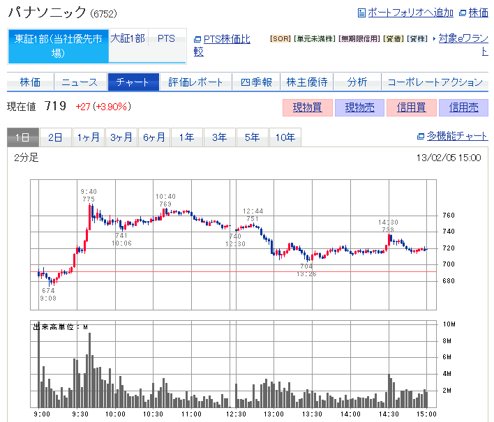 416円高ですか。予想外の上げ方をします。ついていけません。高すぎて買えません。今日も、パナソニックでした。全然儲からないのですが、なぜかパナソニックに惹かれます。明日はさわりません。