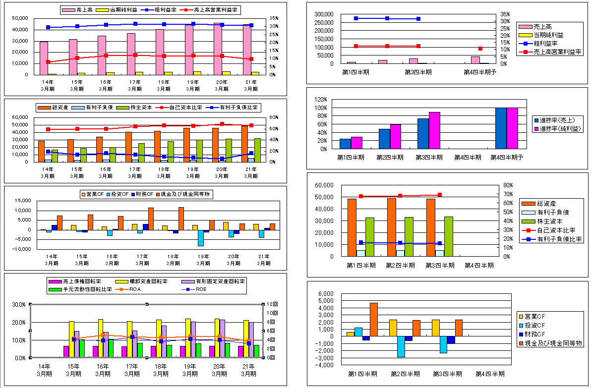 過去の経営成績を見ると、粗利益率は約29~31%を維持している。売上高営業利益率は粗利率に左右され、7~12%で推移していた。今期は、販管費を抑えた効果があり12%まで上昇している。ROAはほぼ10%超で安定している。また、過去数年間を見て有利子負債比率が20%以下なので、健全経営を続けていると思われる。