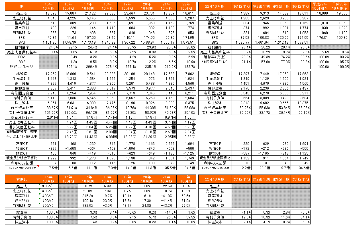 過去の経営成績を見ると、粗利益率は約22~24%で推移していたところ、22年10月期で28%台に上昇している。直近の決算短信によると、「世界的な原油価格の高騰により、当社製品主原料である合成樹脂原料(ポリプロピレン・ポリエチレン)の値上げが数回にわたり行われ、この値上げに対して、製品販売価格への価格転嫁及び生産コスト削減等の諸施策の実施を行った結果による」となっている。売上高営業利益率も粗利率のアップに乗じて9.5%に上昇した。資産効率のアップもさることながら、特筆すべきは、有利子負債の削減か。16年10月期の有利子負債比率は116.66%であったが、22年10月期に25.1%まで削減している。安定した営業キャッシュフローのおかげだろう。