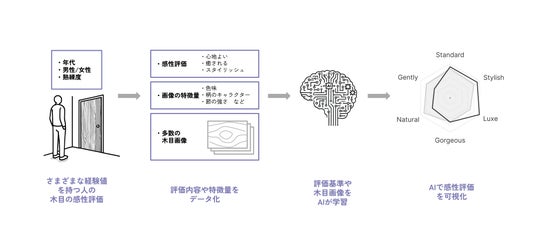 「MOKUMETRIX(TM)」アプリにより「心地よい」「飽きがこない」など、建装材の木目に対する感じ方の推定が可能になり、ウェルビーイングな空間創りに寄与