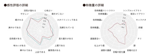 「心地よい」「スタイリッシュである」「重厚感がある」など木目柄を評価する上で重要な15個の感性項目について推定が可能。さらに、木目柄を構成する要素である「板目や柾目の度合い」や「節の強さ」といった16個の特徴量についても数値化が可能になっており、開発時におけるデザイン調整の指標として活用できます。