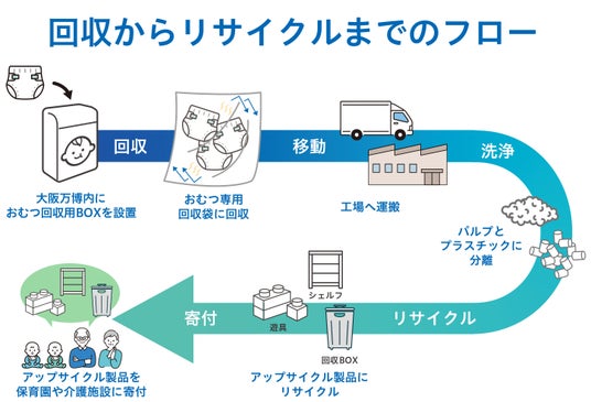 TOPPANホールディングスのグループ会社であるTOPPAN株式会社(本社:東京都文京区、代表取締役社長:齊藤 昌典、以下 TOPPAN)は、2025年日本国際博覧会(大阪・関西万博)において博覧会会期中に会場内で発生する使用済み紙おむつを回収し、リサイクルを行う実証実験を行います。会場内の休憩所やトイレ等の11か所(予定)に回収ボックスを設置し、回収された使用済み紙おむつをリサイクル工場においてパルプとプラスチックに分離、遊具やシェルフ、おむつ回収ボックスなどにアップサイクルを行います。回収からリサイクルまでの一貫工程の実証を行うことで、その重要性を社会に発信します。