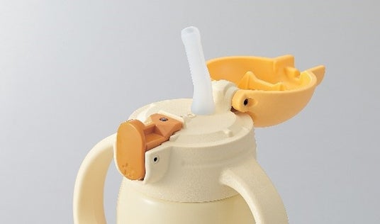 ワンタッチでフタが開いてストローが出てくるので飲みやすく、左右についたハンドルは、小さなお子さまでもつかみやすくなっています。また、ハンドルを持って飲む際に本体が自然と傾く設計なので、最後までしっかりと飲むことができます。