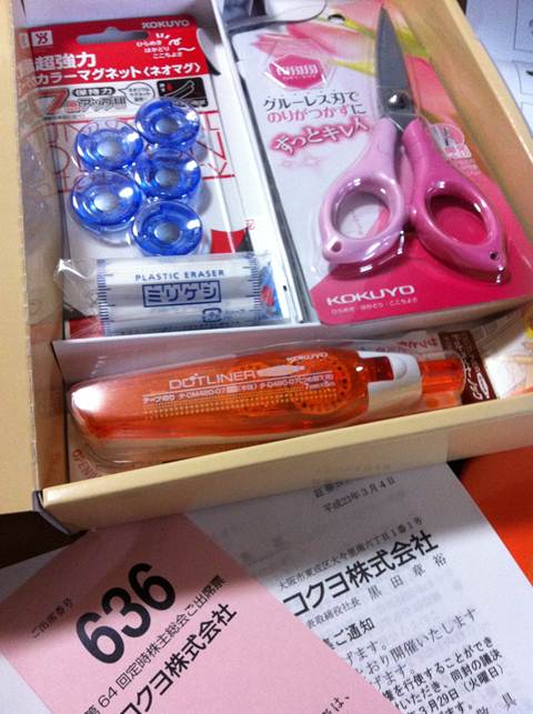 【7984】コクヨの株主優待本日、届きました。 内容は3000円相当の文房具との事でしたが・・・。 ノートやボールペンにシャープペン・・・。 後は新製品ぽいクリップや、のりでした。 まぁ想像通りですね。www 今後の株価に期待ってことで。 がんばれーコクヨー!!