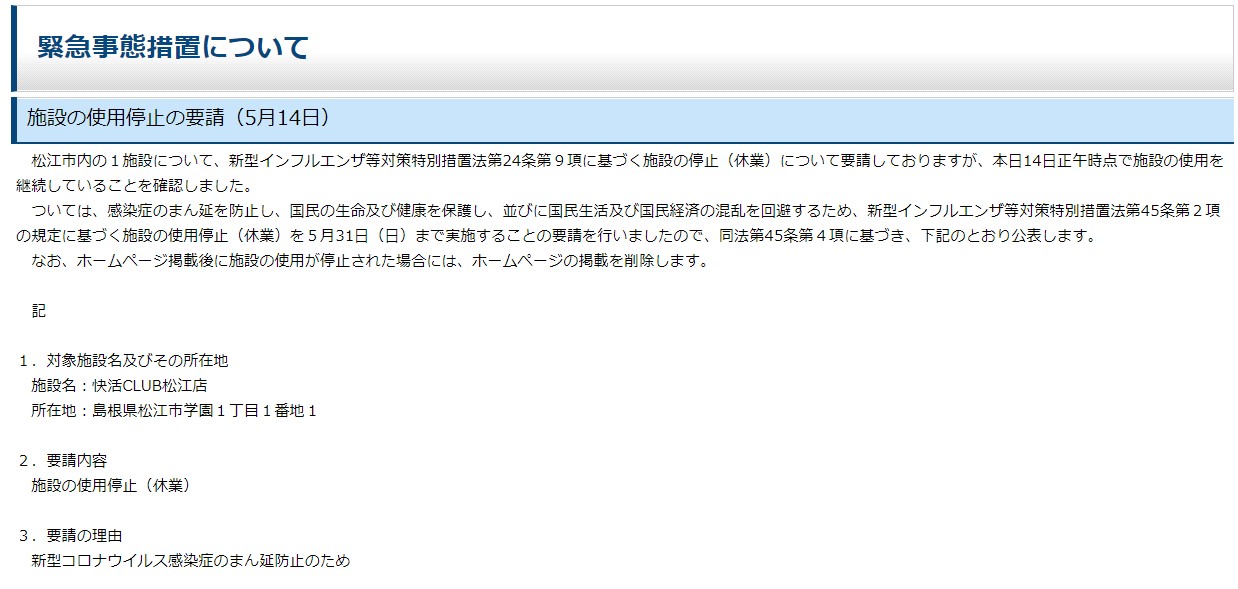 関連会社、快活フロンティアの強引な営業継続が問題となっており、島根県の店舗が新型コロナウイルス感染者が長期利用していたにも関わらず、休業要請も保健所の立入検査も拒否しており、本日店舗名が公表された。