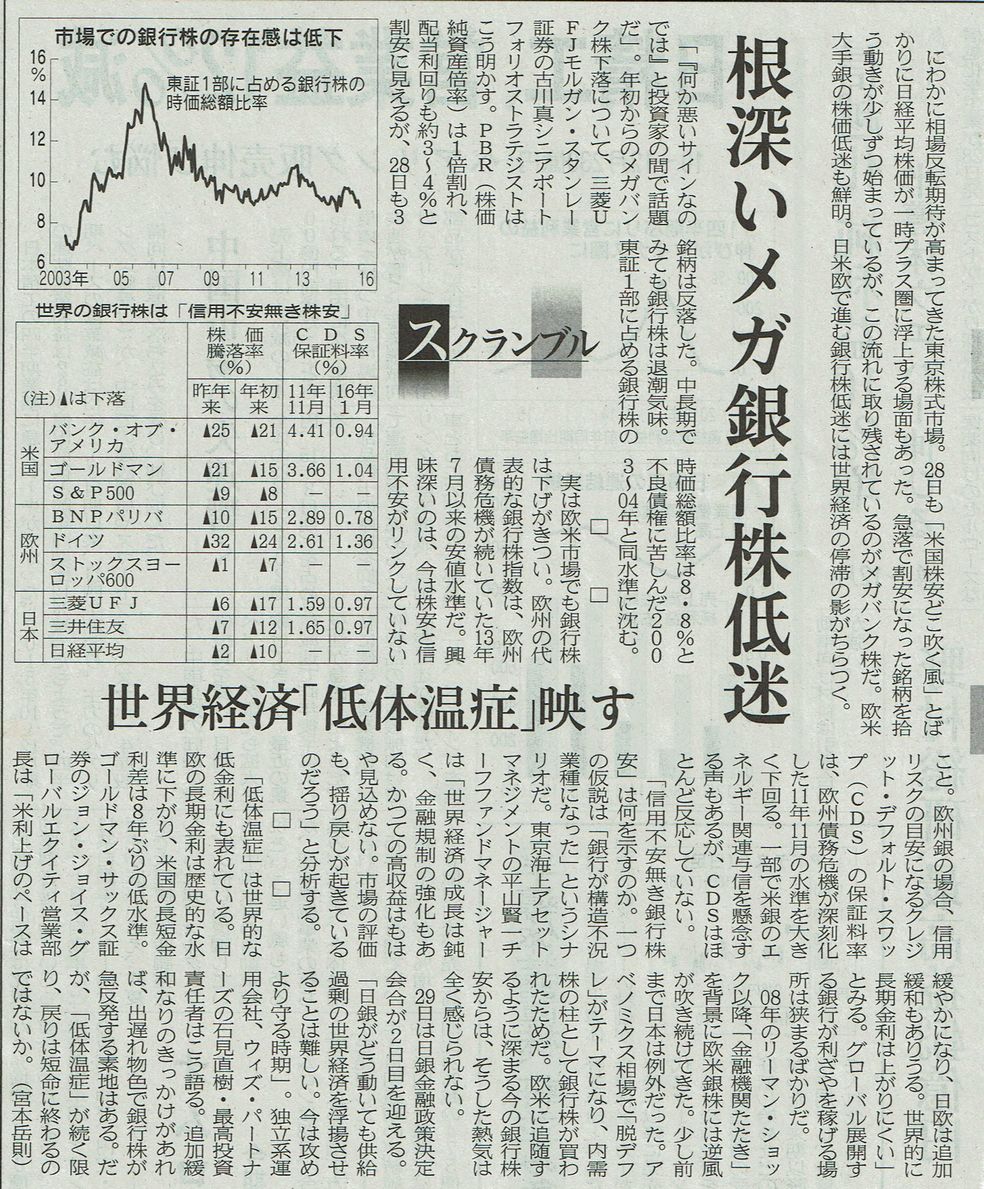 今朝の日経朝刊の感想文です。 今振り返ると、今日の銀行株の下落を予感させるものでした。_______________________________________ (記事要約) ・『何か悪いサインなのでは』と投資家の間で話題だ。 ... ...続きを読む -