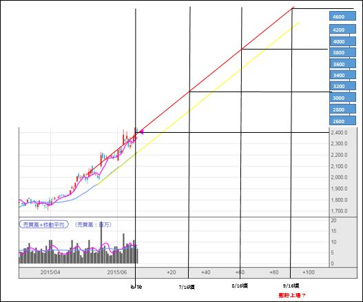 あまりにも自然で、逆に不自然な最近の移動平均線の上昇推移から、いつ頃いくらで売るかを考えていて、線を引いてみたので、お遊びで載せてみます。