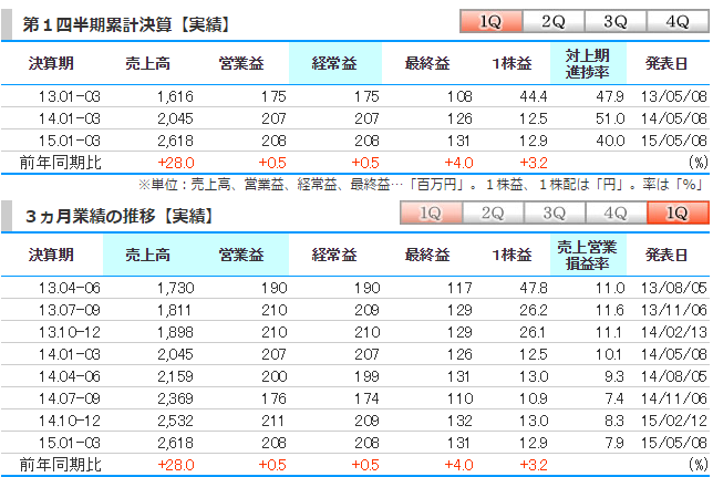 直近3ヵ月の実績である7-9月期(3Q)の連結経常利益は前年同期比55.7%増の2.7億円に拡大し、売上営業利益率は前年同期の7.4%→9.4%に改善した。