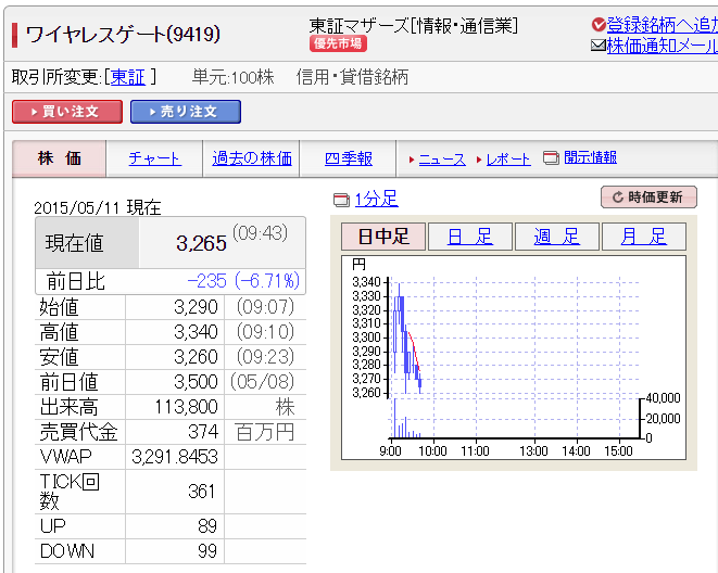 ワイヤレスGの株価は10時7分現在3025円(▼60円)