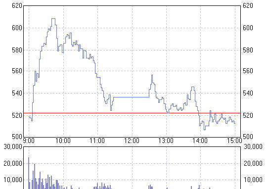 年初来高値を更新し、売り方の買い戻しを誘う格好に。80円ストップ高配分の522円で1280万株超の成り行き買い注文を残す。 -