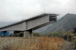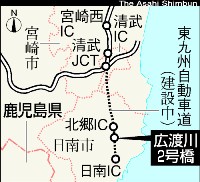 国の直轄事業である2号橋は2008年9月に着工し、工費は10億2千万円。広渡川の両岸から建設を進め、今年2月に完成する計画だった。だが、昨年4月、右岸側から115メートルまで延びている橋げたに、幅最大1ミリのひびが長さ約9メートルにわたり4カ所見つかった。