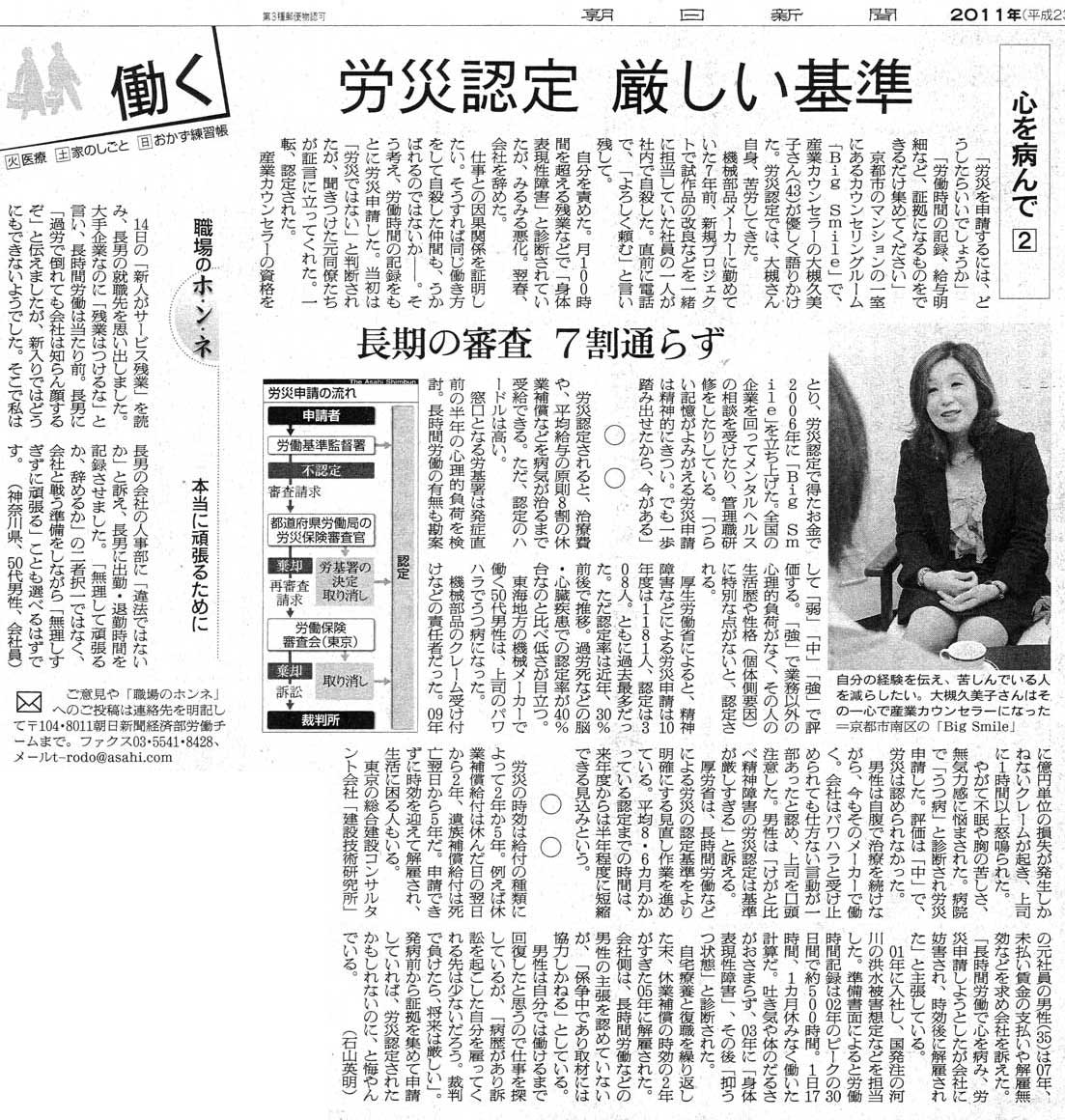 京都市のマンションの一室にあるカウンセリングルーム「Big Smile」で、産業カウンセラーの大槻久美子さん(43)が優しく語りかけた。労災認定では、大槻さん自身、苦労してきた。